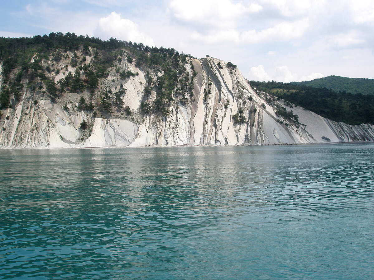 Каменные обрывы из светлого известняка тянутся вдоль горных хребтов, отражая солнечный свет и сияя белоснежным блеском. Особенно впечатляюще они выглядят на фоне зелёных лесов.