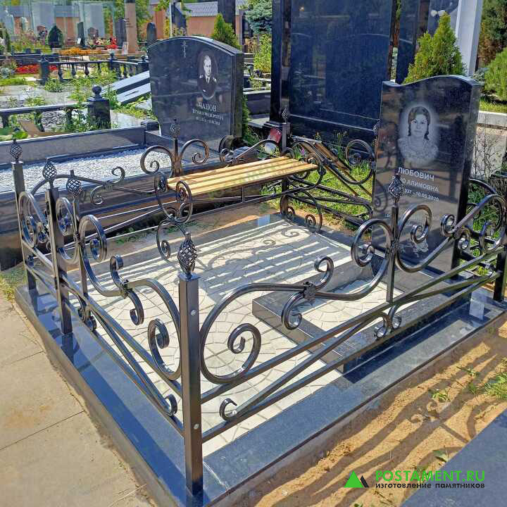 Кованая ограда, ажурным кружевом опоясывающая гранитный постамент, покоящийся на бетонном основании, органично вплетена в общую композицию. Причудливые завитки и изящные навершия придают этому месту скорби трогательную нежность.