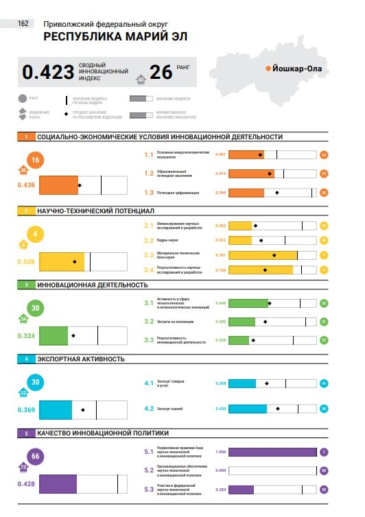 В рейтинге Инновационного развития регионов России Марий Эл заняла 26 место Институт статистических исследований и экономики знаний (ИСИЭЗ) НИУ ВШЭ представил 10-й выпуск рейтинга инновационного развития субъектов РФ. В тройку лидеров вошли сразу два региона Приволжского федерального округа – Татарстан и Нижегородская область. На первой строчке рейтинга традиционно расположилась Москва. По оценке аналитиков, за минувший год позиция Марий Эл значительно улучшилась, сразу на 14 позиций. По одному из критериев рейтинга, оценке научно-исследовательского потенциала, наша республика занимает 4-е место по России. А по социально-экономическим условиям инновационной деятельности, Марий Эл занимает 16-е место.