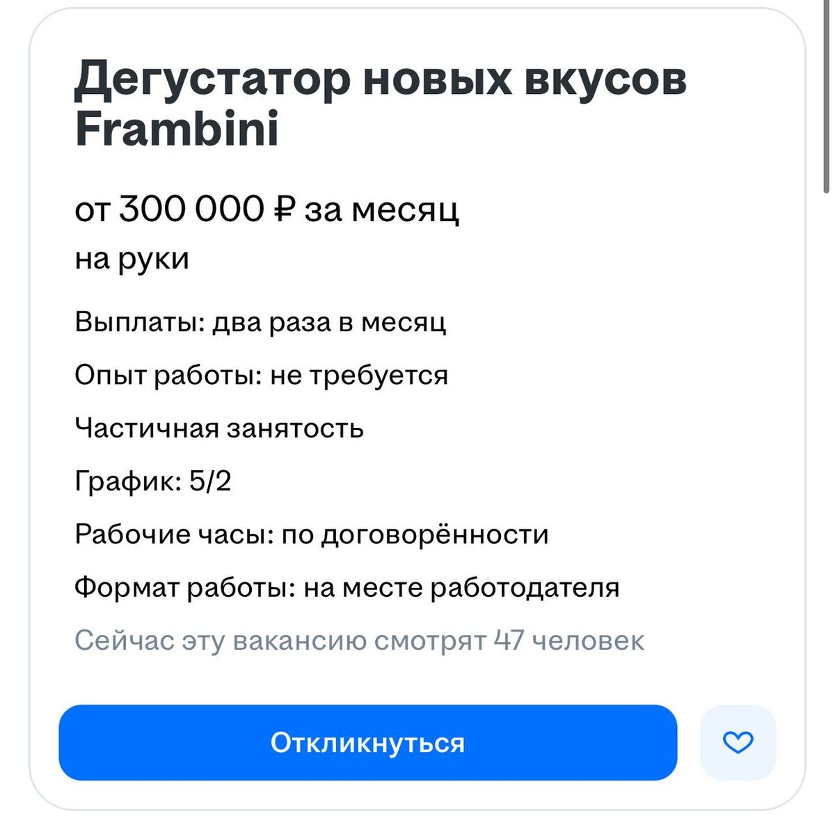Увидела новость про забавную вакансию от Фрамбини и подумала сначала, что это шутка 🍫 Но нет! Ищут дегустатора новых вкусов, вакансия висит на hh🥺 Задача - профессионально пробовать ягоды в шоколаде и говорить, какие вкусные, а какие - не такие вкусные. Взамен предлагают ДМС, корпоративный фитнес и от 300.000 рублей за месяц. В такие моменты, конечно, начинаешь задумываться… Бежим откликаться, девочки..?
