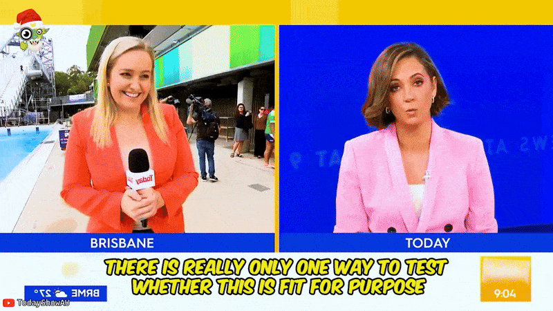 Журналистка вела спокойный репортаж из школы, но в финале неожиданно разбежалась и прыгнула в бассейн. Никто не понял зачем, зато зрителям было весело.