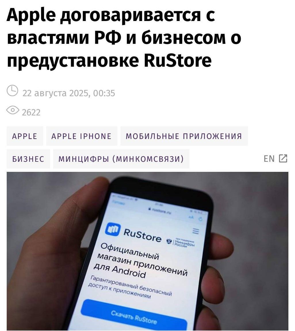Apple уже ведёт переговоры с российскими властями о предустановке на айфоны магазина RuStore, пишут СМИ. В связи с этим заблокированные в App Store приложения российских банков и других организаций могут в ближайшее время вернуться на iPhone Заря | Новости - Подписаться