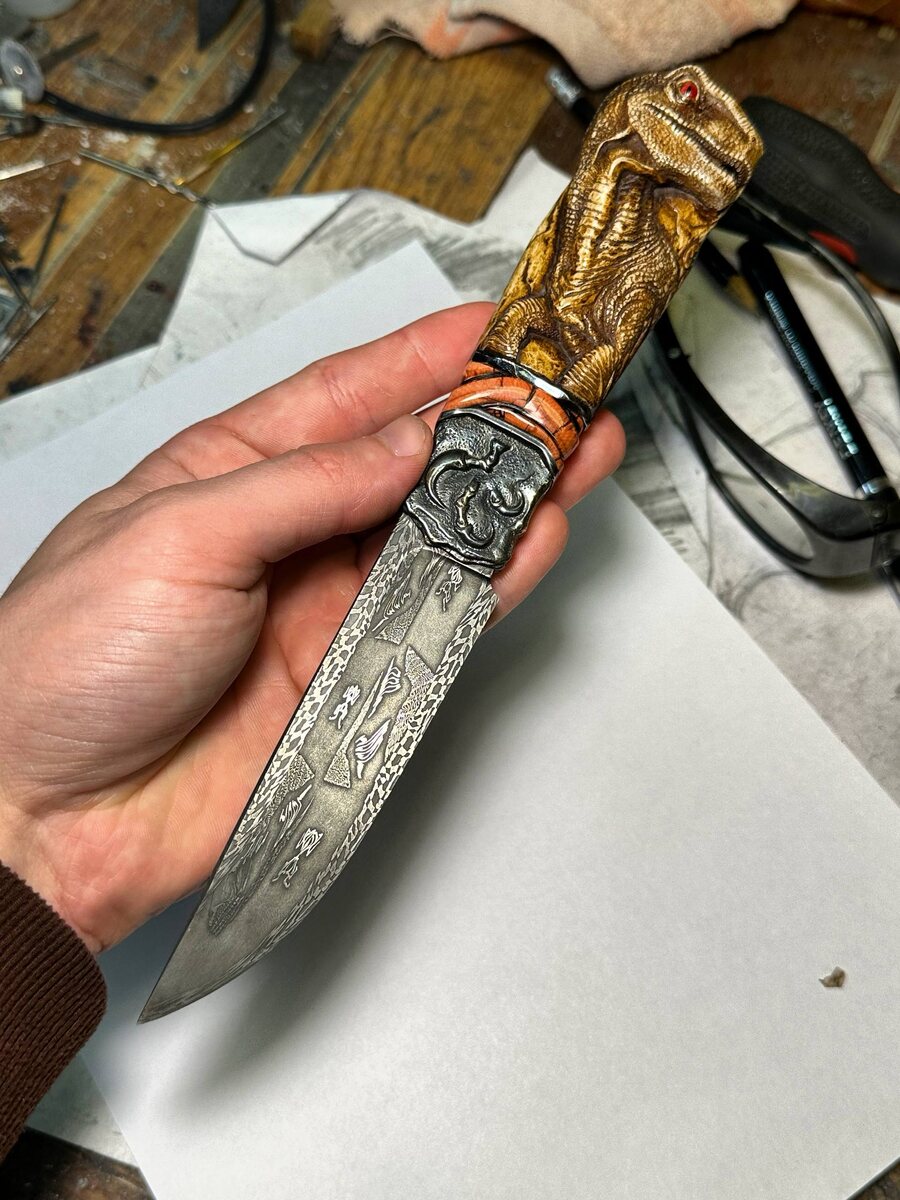 В ответ на пост Друзья, помните эту работу? Ещё месяц назад мы показывали её на раннем этапе — тогда на рукояти было много незавершённых деталей. Теперь настало время раскрыть всю красоту результата! 👏 Мастер-художник Артём Осипов проработал каждую деталь: на рукояти можно рассмотреть каждую чешую на динозавре — точность и реализм поражают. А особый шик работе придаёт глаз, выполненный из настоящего зуба мамонта! Почему это эксклюзив? - *Ручная резьба* высочайшего уровня - *Материалы премиум-класса*: натуральный зуб мамонта, дамаск - *Авторская работа*: второго такого ножа не существует Такой нож — не просто инструмент, а настоящая коллекционная ценность для ценителей, коллекционеров и поклонников уникального оружейного искусства. Впереди еще много работы по данной композиции! #кузницаназарова #ручнаяработа #авторскийнож #коллекционныйнож #уникальныематериалы #ножидляколлекции #подарокмужчине