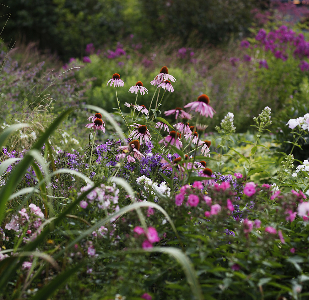 Здесь шалфеи, котовники, эхинацея, лапчатки, герани, монарды, злаки, кровохлебки и, конечно же, флоксы.