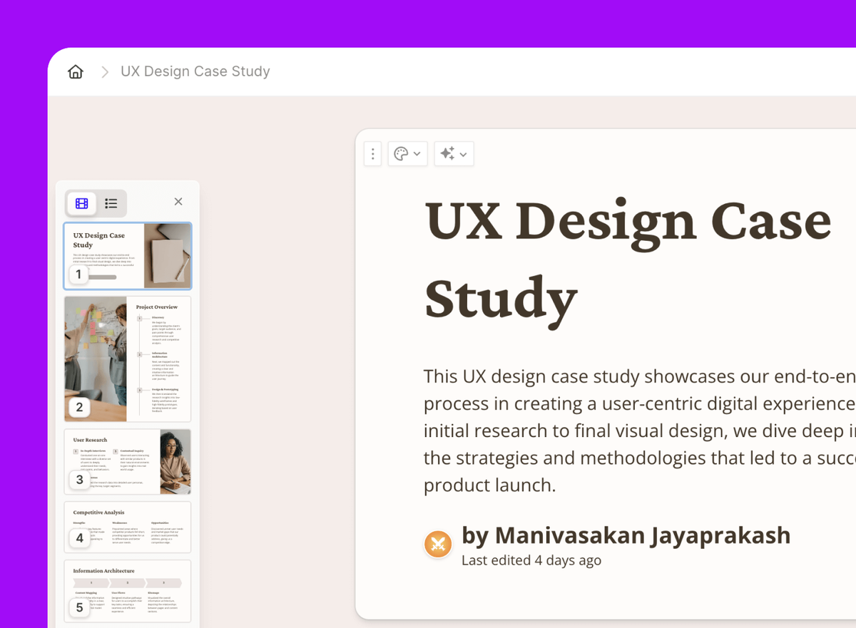 Можете загрузить файлы Google Docs, Word, PDF или даже ссылку из Notion — Gamma превратит контент в стильную презентацию с подходящими изображениями.