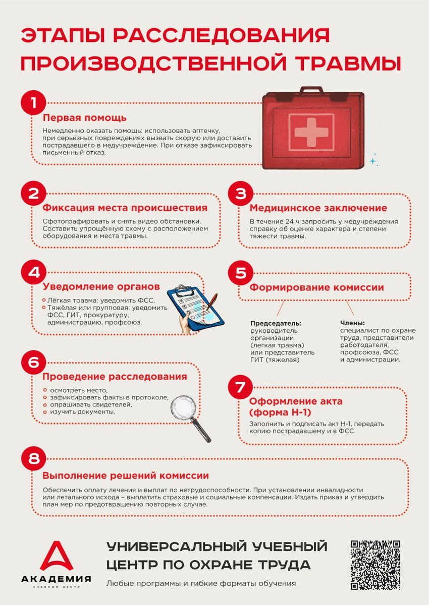 ⚡️Несчастный случай на производстве — стресс и для работника, и для работодателя. Важно понимать: 🔴такие случаи подлежат обязательному расследованию, 🔴работодатель несёт юридическую ответственность, 🔴ошибки в оформлении документов могут привести к штрафам и проблемам с проверяющими органами. Чтобы упростить задачу для руководителей и специалистов по охране труда, мы подготовили бесплатную памятку по расследованию несчастных случаев. В ней пошаговый алгоритм действий, образцы документов и подсказки на что обратить внимание. ❓А как в ваших компаниях организован процесс расследования? Есть отработанный регламент или каждый раз приходится разбираться заново?