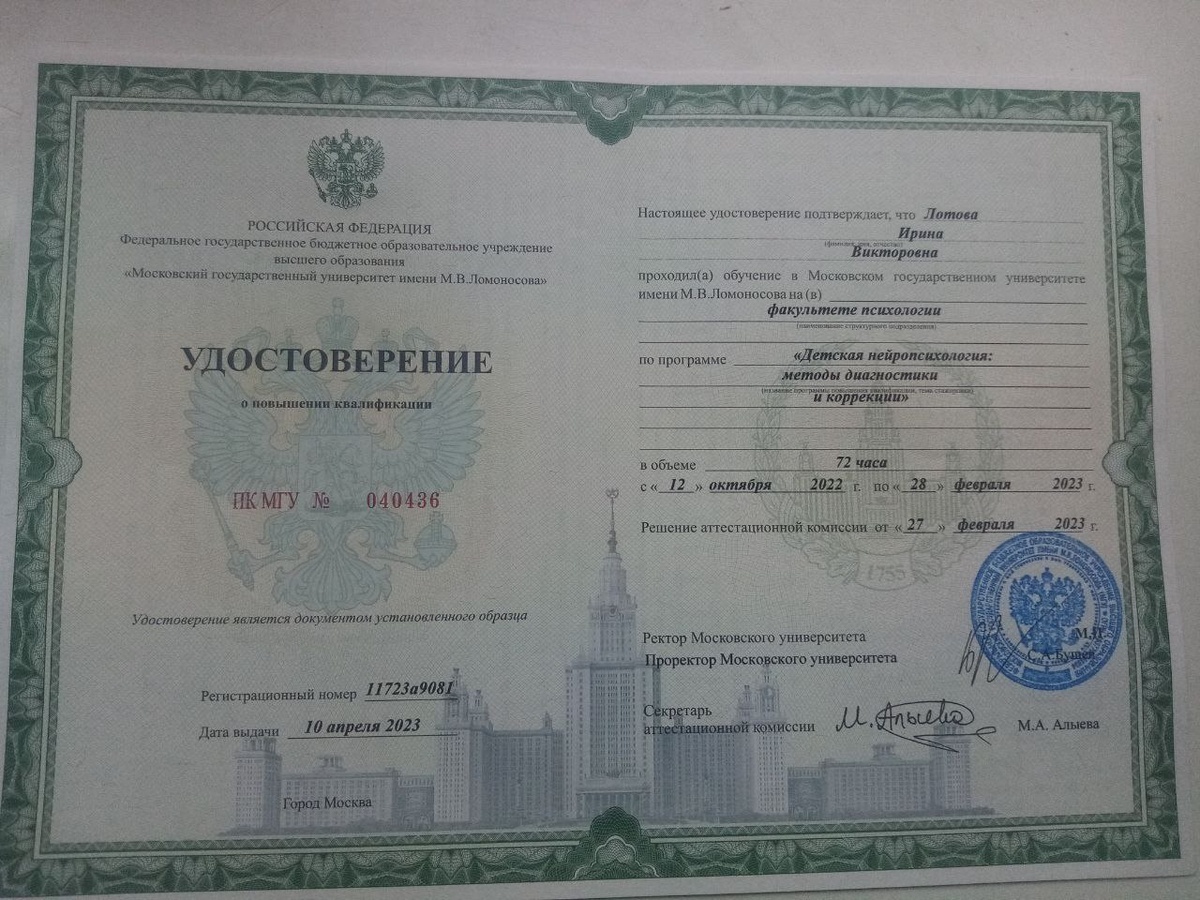 В 2022/23 году я прошла повышение квалификации при МГУ им. Ломоносова по курсу "Детская нейропсихология: методы диагностики и коррекции"