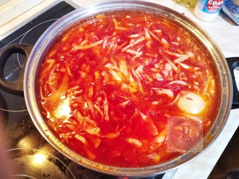 Цвет борща становится насыщенным, ярко-красным. Нужно накрыть его крышкой и еще проварить минут 15.