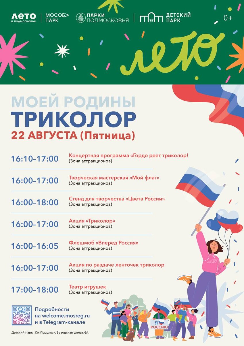 ✨ Фестиваль "Моей Родины триколор* В программе: 🇷🇺 Концертная программа 🇷🇺 Творческая мастерская 🇷🇺Флешмоб «Вперед Россия» 🇷🇺 Акция по раздаче ленточек 🇷🇺 Театр игрушек 🚫 Возраст: 0+ 📆 22.08.2025 🕒 16:00 🏢 Детский парк культуры и отдыха 📍 г. Подольск, мкр. Климовск, ул. Заводская, 6а 💰 Вход свободный❗️ ⭐Разместить публикацию ⭐Поддержать канал голосом 💰 Стань курьером в Подольске – твой доход, твое время! ✅ Мероприятия Подольск https://dzen.ru/id/66ed500f7b5671493eca3fd6 http://vk.com/podolsk_events http://dzen.ru/podolsk_events