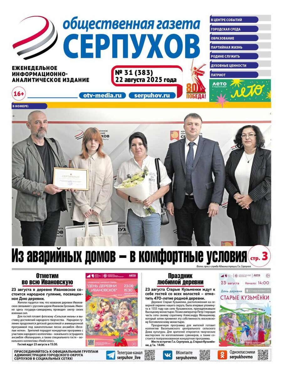 🗞️ О самых интересных событиях Серпуховского региона читайте в новом номере «Общественной газеты – Серпухов»: ______________________________________________ ✔️Чтобы зима не застала врасплох. Расскажем, как проходит подготовка жилищного фонда к осенне-зимнему отопительному периоду в Большом Серпухове. ✔️Новые квартиры для серпуховичей! Еще одна семья получила сертификат на жилье по областной программе переселения граждан из аварийного жилья. ✔️Ближе к людям. В Серпухове жители могут лично задать вопросы и получить ответы от первых лиц округа во время выездных администраций. ✔️Серпухов преображается: новые подъезды и комфортные дворы уже этим летом! Глава округа лично инспектирует ход работ. ✔️Боль утраты и вечная память. В Серпухове увековечат подвиг героев СВО в «Книге памяти». ✔️Возрождение святыни. История возрождения храма Архангела Михаила, где впервые за долгие годы совершили венчание и крещение. ✔️ «Единая Россия» в Серпухове: поддержка культуры, помощь ветеранам и детям.