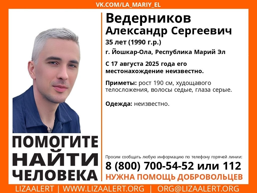 ‼️ В Йошкар-Оле ищут 35-летнего Александра Ведерникова Волонтеры поисково-спасательного отряда «ЛизаАлерт» в Марий Эл просят помощи в поисках пропавшего.