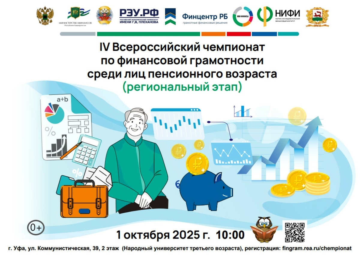 Министерство финансов Республики Башкортостан сообщает о старте регионального этапа IV Всероссийского чемпионата по финансовой грамотности среди пенсионеров. Интеллектуальное соревнование пройдет 1 октября в 10:00 в Народном университете третьего возраста. К участию приглашаются все жители республики, имеющие подтвержденный статус пенсионера. Для того чтобы заявить о себе, необходимо пройти регистрацию на официальном сайте Федерального методического центра финансовой грамотности населения РЭУ имени Плеханова до 25 сентября включительно. Регистрационная форма доступна по адресу: https://fingram.rea.ru/chempionat. Три лучших знатока финансов из Башкортостана, определенные по итогам регионального этапа, получат право представлять республику в финальном всероссийском турнире. Он состоится в онлайн-формате 23 октября. Все участники как регионального, так и федерального этапов будут отмечены дипломами, а также получат ценные призы и памятные подарки от организаторов. Чтобы помочь участникам