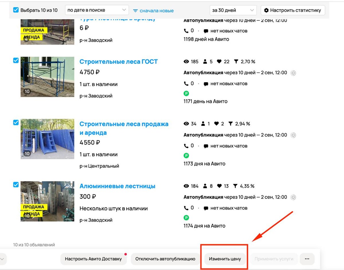 Пакетное изменение цены на объявлениях