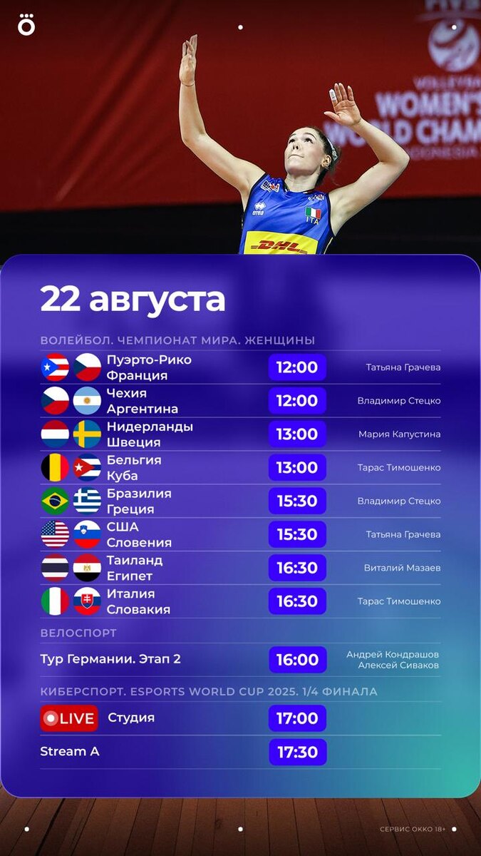 Старт Бундеслиги и женского ЧМ по волейболу, FONBET Кубок Блинова, тур Германии и другие трансляции.