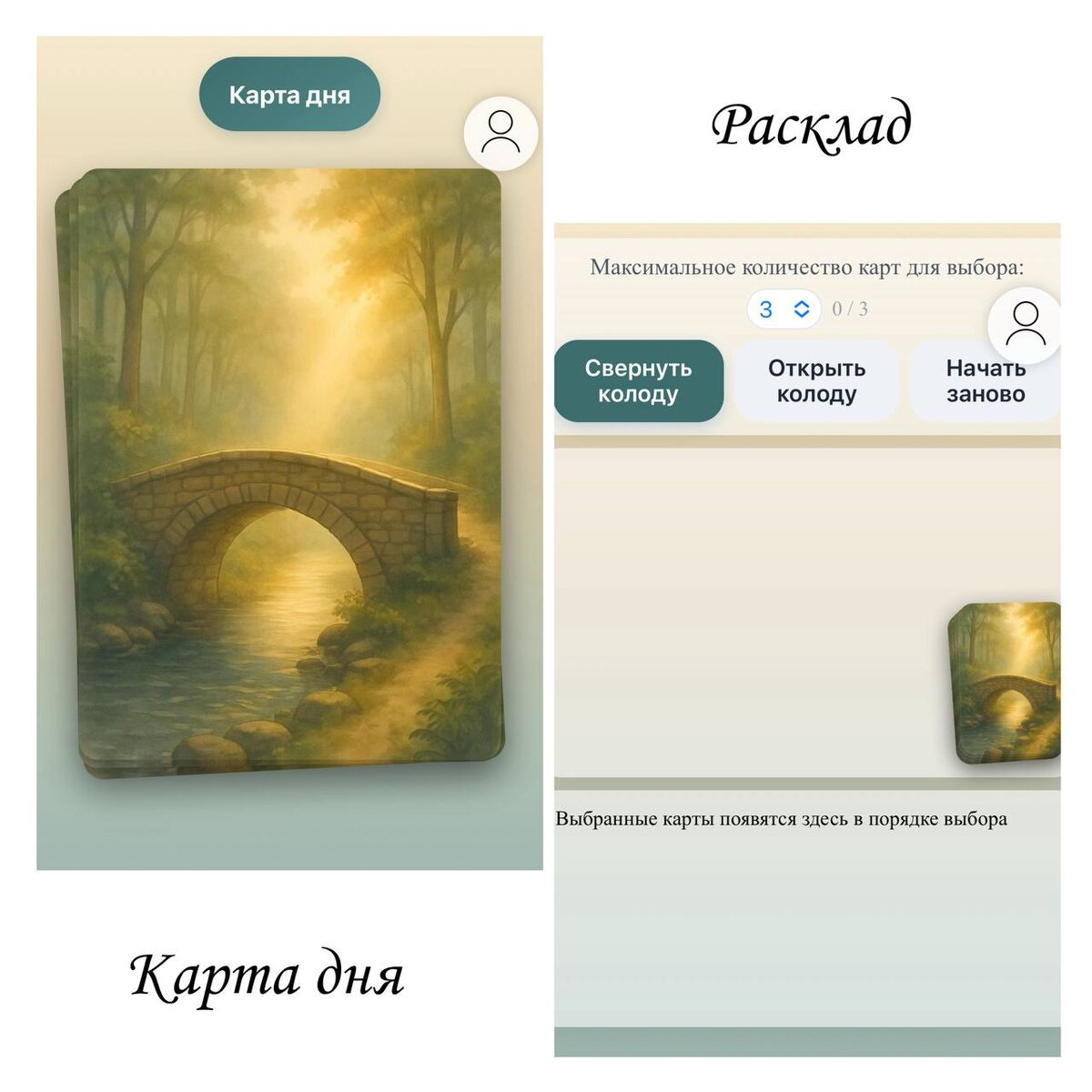 Теперь у вас всегда под рукой будет личный инструмент для ясности и поддержки: утром - карта дня, днём - расклад на важный вопрос. Всё в одном приложении, доступно в пару кликов.
