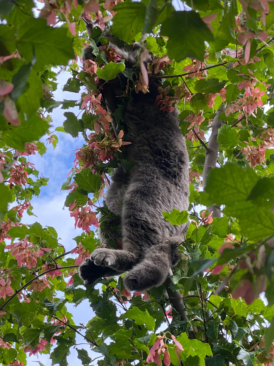 Ныла я тут, что у меня томаты с огурцами плохо уродились. Зато на дереве вот какой "урожай". Крупный, жирненький, наглый. Были у меня на этой неделе трагикомичные сутки из мира животных. Поздно вечером к нам на участок пришел кот, чем вызвал бурное недовольство моей собаки. Кот залез на веранду, и далее все стандартно: собака прыгает и лает, снося все вокруг, кот относительно спокойно ее созерцает, иногда шипя и показывая лапу с когтями. Серый нахал явно домашний, и собака его не сильно пугает. Моя собака к кошкам относится двояко - своих не трогает, могут вместе на крыльце посидеть, а чужих гоняет, облаивает, но не давит. Дважды ночью я выгоняла кота с участка, и дважды он возвращался. Хотела уже поймать и запереть в котельной - погреется, поест, а утром буду решать, что делать. Но кот в руки не дается, перевозбужден. Потом удалось его выгнать с веранды, но началась беготня по участку, лай, шипение, потом все затихло. Бедные соседи... Утром - тишина. Кота на веранде нет. Обрадовалась.
