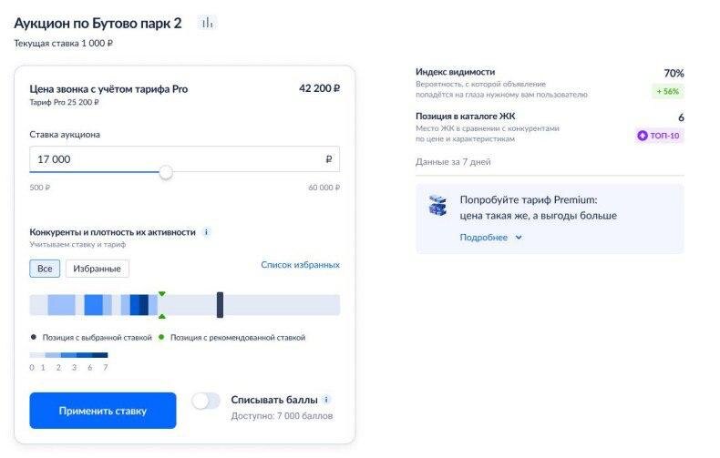 ℹ️ В панели управления можно будет самому выбрать конкурентные ЖК и оценить уровень ставки для их обхода.