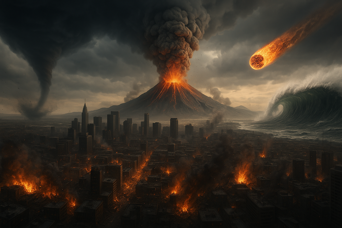 Падение крупного астероида (менее 0,1% вероятности) способно вызвать цунами высотой в сотни метров, глобальные пожары и «ударную зиму», аналогичную той, что уничтожила динозавров.