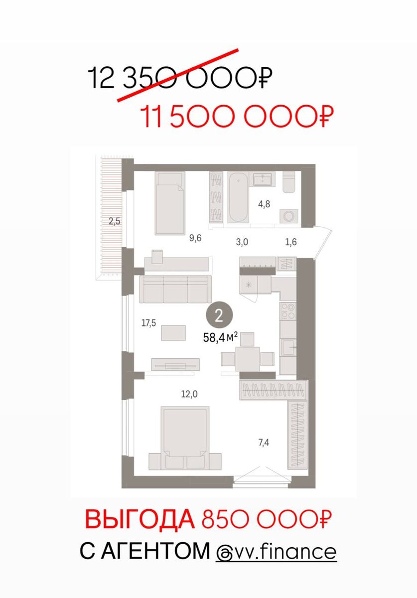 ⚡️Выгода 850 000₽: Квартира с кухней-гостиной и двумя спальнями в квартале