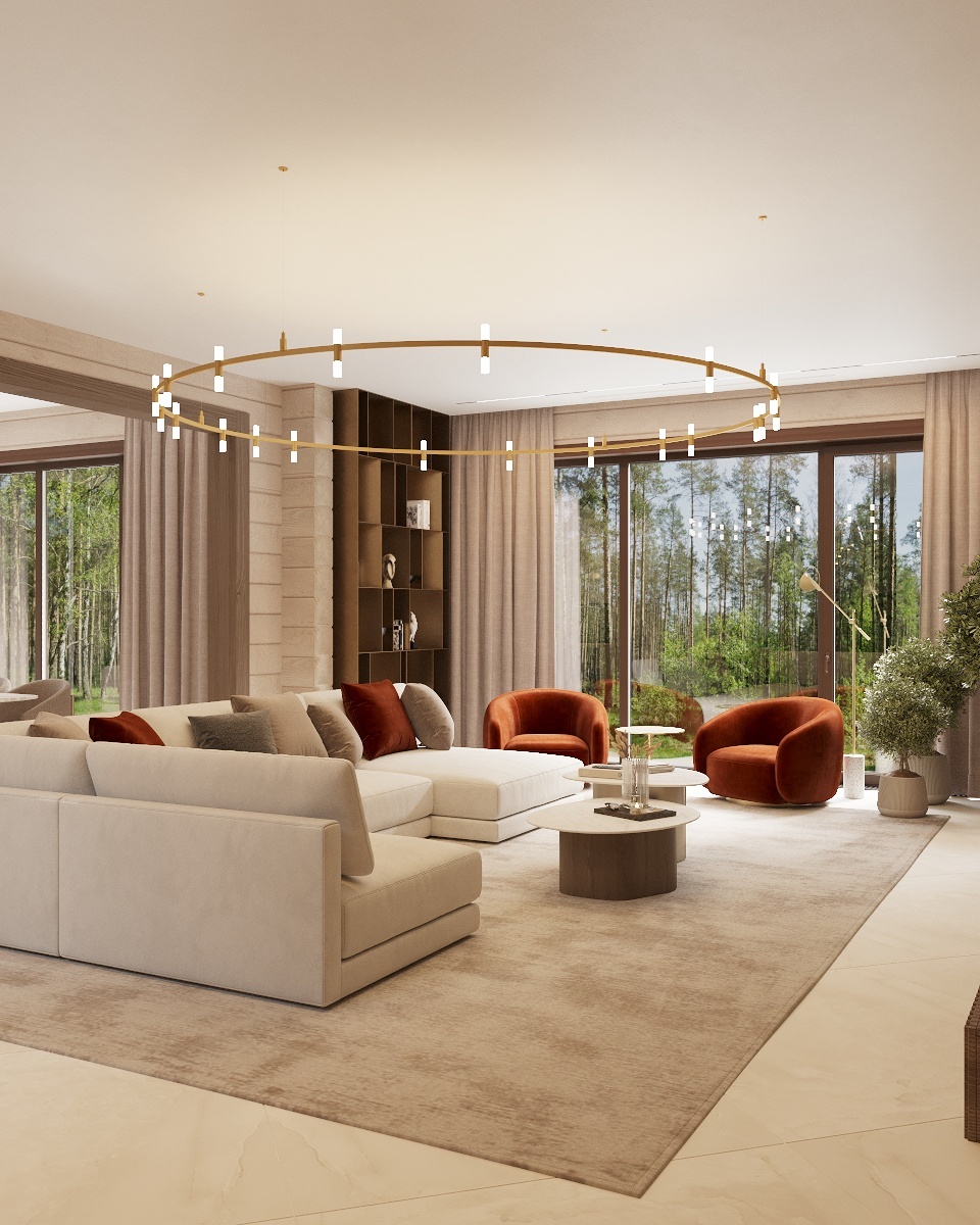 Для создания этого стильного интерьера в загородном доме в Подмосковье дизайнеры студии SOZO сделали ставку на нейтральные оттенки и натуральные материалы. Пространство, предназначенное для семьи из четырех человек, должно было быть легким, функциональным и отражать ритм жизни, а также совмещать вкусовые предпочтения как родителей, так и детей. В результате получился микс неоклассики и современного стиля с нотками эко. В спальне, например, каждая деталь работает на создание атмосферы уюта и спокойствия. Абстрактная люстра задает ритм, а мягкое кресло с плавными формами словно дополняет ее, образуя единую художественную композицию. Окна в пол стирают границы между интерьером и окружающей природой, наполняя комнату светом и ощущением свободы. Деревянные стены добавляют тепла и фактуры, а встроенный шкаф обеспечивает порядок и функциональность. Особое внимание дизайнеры уделили функциональности пространства. Гардеробная была интегрирована в кабинет, создавая удобное и практичное решение д