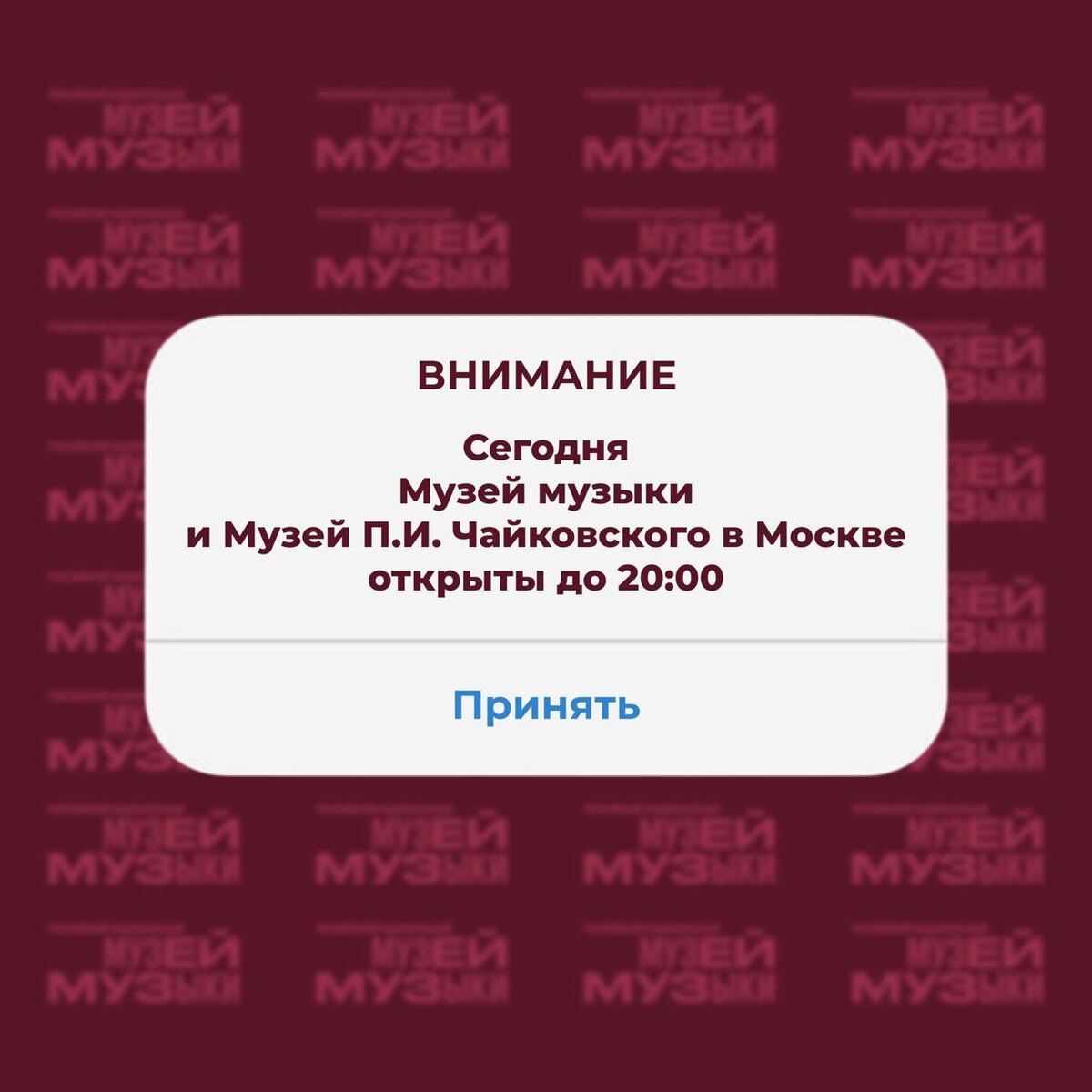 Уважаемые посетители! Напоминаю вам: сегодня двери Музея музыки и Музея П.И.Чайковского открыты до 20:00! Проведите время с пользой и вдохновением среди шедевров музыкальной культуры. ☺️