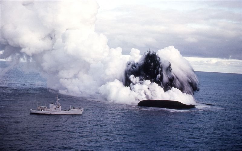 В ноябре 1963 года в прибрежных водах Исландии начал образовываться новый необитаемый остров. Этот снимок из архивов Wikimedia был сделан во время пролета исследователей на вертолете над извержением подводного вулкана, в результате которого и появился Сюртсей. Это один из немногих островов, появившихся в наше время, и едва ли не единственный, за которым и во время, и сразу после создания могли наблюдать ученые. Исследователи зафиксировали, что уже в первые часы рождения острова на Сюртсее поселились о бактерии и прочие микроорганизмы. #История_факт