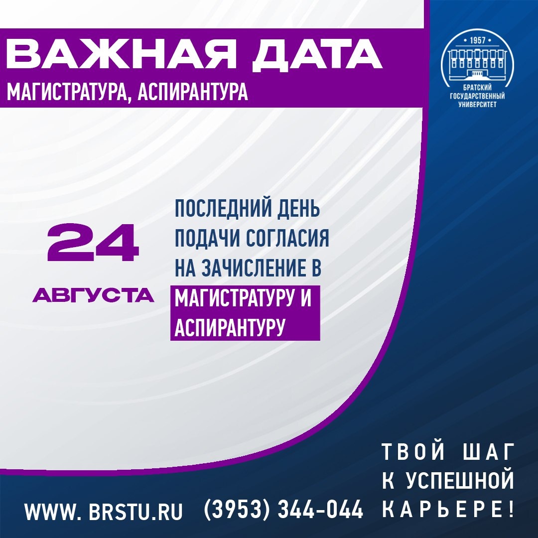 🎓 Абитуриенты, внимание! Следим за сроками Приёмной кампании - 2025👇 🚩24 августа - последний день подачи согласия на зачисление на бюджетные места по программам магистратуры и по программам подготовки научных и научно-педагогических кадров в аспирантуре. Остались вопросы? Звони: 8-3953-344-022 ☎️ #абитуриенту