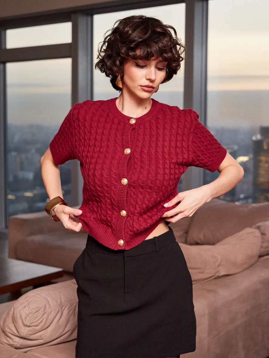 Вязанный укороченный кардиган на пуговицах. Отлично сочетается со всеми предметами гардероба. Классическая модель имеет застежку спереди, V-образный вырез с отсутствием воротника.