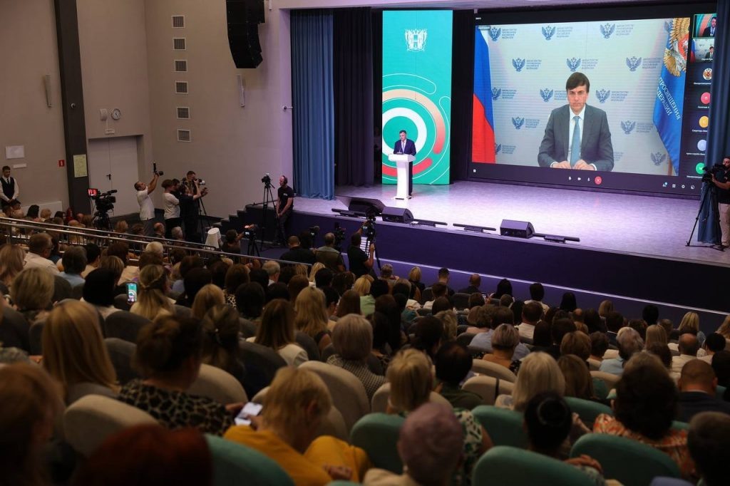 В Ростове состоялось августовское педагогическое совещание, где обсудили задачи нового учебного года. В работе приняли участие учителя, руководители образовательных организаций из разных городов и районов области. Наш город представила заместитель главы администрации по социальным вопросам Ольга Мурзина вместе с коллегами из управления образования. С приветственным словом к участникам по видеосвязи обратился министр просвещения РФ Сергей Кравцов, а в зале выступил глава региона Юрий Слюсарь. Главные темы встречи – развитие системы образования, строительство и капитальный ремонт школ, поддержка педагогов и улучшение условий для учеников. Особое внимание уделили Батайску: уже началось строительство новой школы, а учащиеся младших классов школы № 6 временно будут заниматься в модульном здании. Фото пресс-службы администрации города.