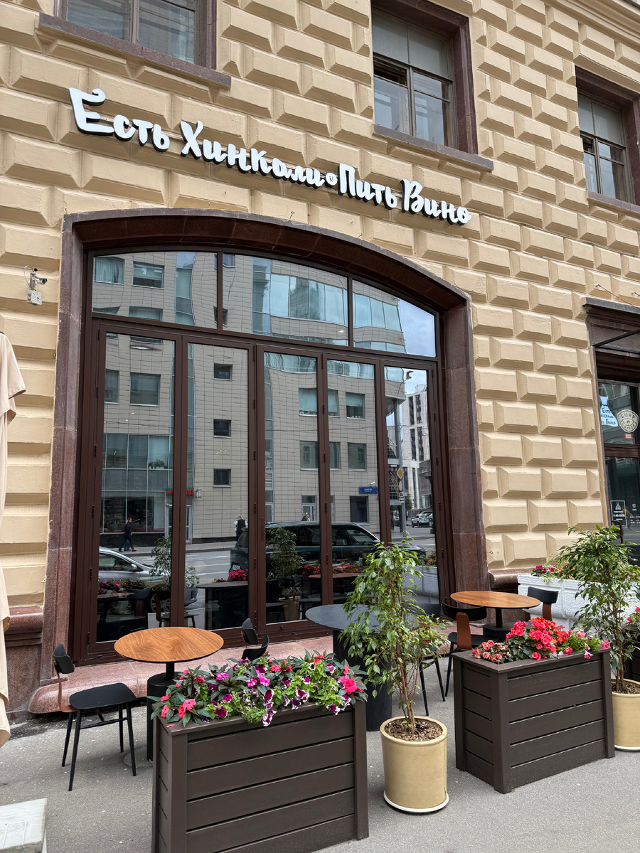 У большой гостеприимной «семьи» сети LL Group «Есть Хинкали & Пить Вино» открылся пятый ресторан в Орликовом переулке в Москве. Очень уютный ресторанчик, заходишь внутрь и попадаешь в такую укутывающую гостеприимную атмосферу, не много посадок, в центре стеклянный винный шкаф/витрина, яркий акцент в виде картины с девушкой, пьющей хинкали через трубочку (забавно). Конечно же, «как вы лодку назовете», то есть сюда я шла именно есть хинкали и пить вино. В честь открытия, между прочем, гостей угощают приветственным бокалом вина! Прям люблю такое! В меню огромный выбор разнообразных хинкали, примечательно, что разные вкусы можно выбрать даже по 1 штучке, обычно в ресторанах ставят минимум 3. Каждый вид можно заказать вареным или жаренным, что тоже удобно. Мы взяли классические, со свининой и говядиной, грузинские равиоли (с рикоттой, соусом из шалфея и пармезана), черные хинкали с креветками, и два сладких варианта: с вишней, и шоколадные с малиной. Что сказать, это о
