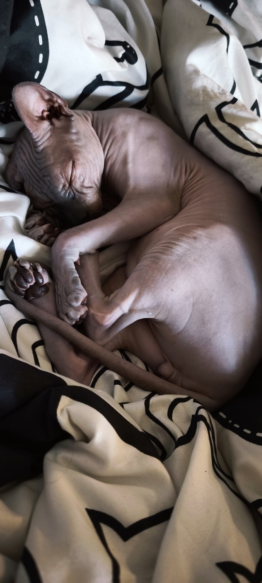 Когда мы принесли Василька домой, он сразу стал нашим любимчиком. У сфинксов особая внешность: они без шерсти, складчатые, и иногда люди думают, что они выглядят "сурово". Но стоит взять Василька на руки и понимаешь: это самое нежное и ласковое создание на свете😽