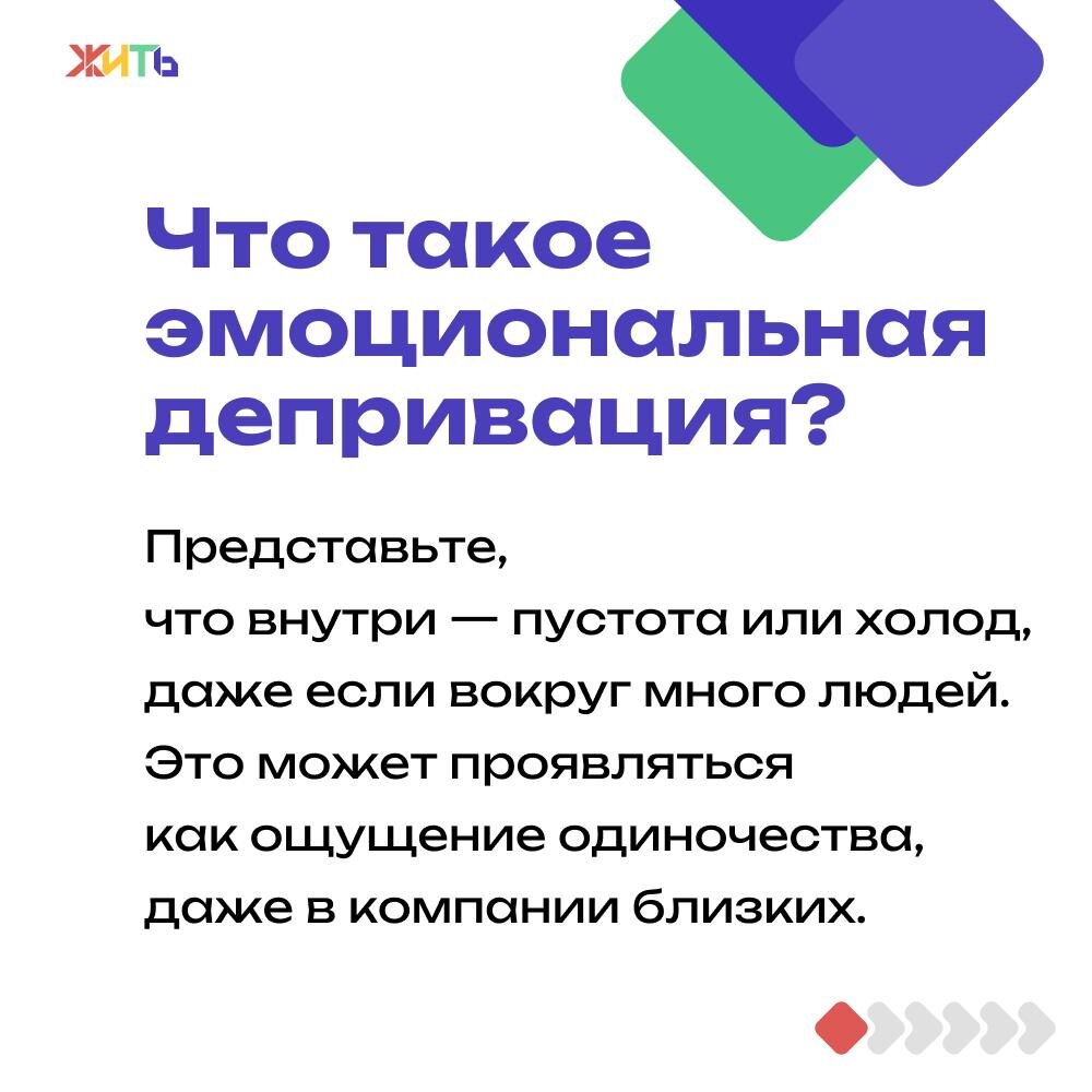 Что такое эмоциональная депривация? Это состояние, при котором человек испытывает недостаток эмоциональной поддержки, тепла и близости. В результате — ощущение пустоты, апатии, снижение настроения и трудности в установлении связей с окружающими. Мы подготовили для вас серию слайдов, где рассказываем, как определить у себя признаки эмоциональной депривации и что делать для восстановления эмоционального баланса. #проверено@zhit