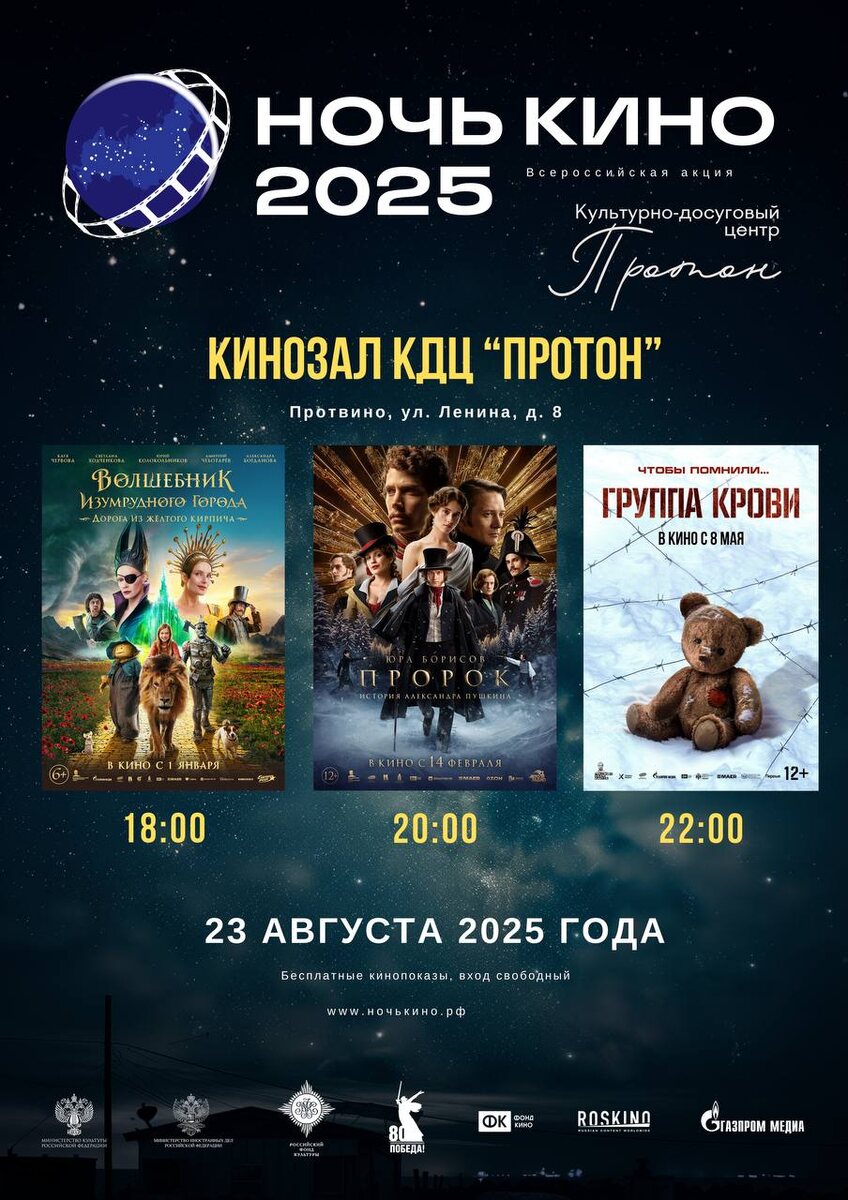 ✨ Ночь кино 2025 будет и в Протвино 🎞️ В новом кинотеатре 🌑 18:00 «Волшебник Изумрудного города. Дорога из жёлтого кирпича» 6+ 🌑 20:00 «Пророк. История Александра Пушкина» 12+ 🌑 22:00 «Группа крови» 12+ 📆 23.08.2025 🏢 ДК "Протон" 📍 г.о. Серпухов, г. Протвино, ул. Ленина, 8 💰 Вход свободный❗️ ⭐Разместить публикацию ⭐Поддержать канал голосом 💰 Стань курьером в Серпухове – твой доход, твое время! ✅ Мероприятия Серпухов https://dzen.ru/id/66f01c6eb4c6fe60c9ca1608 http://vk.com/serpukhov_events http://dzen.ru/serpukhov_events