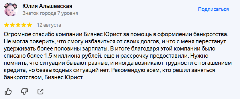 Многие думают, что банкротство — это страшно и навсегда. Но истории наших Клиентов доказывают: жизнь после долгов есть! Сегодня мы собрали 8 отзывов людей, которые доверились нам и не пожалели. Проверить отзыв - https://yandex.ru/maps/org/biznes_yurist/75949184696/reviews/?ll=52.414526%2C55.740727&utm_source=review&z=13 Проверить отзыв - https://yandex.ru/maps/org/201587426378/reviews?reviews%5BpublicId%5D=w56eqgu93vr55zuehx3erkqef0&si=kpq1ycqam5tf36jmkhqy3b8rj8&utm_source=review Проверить отзыв - https://yandex.ru/maps/org/23269733395/reviews?reviews%5BpublicId%5D=wq9zck06kqg6xnc300tkfgz3bm&si=kpq1ycqam5tf36jmkhqy3b8rj8&utm_source=review Проверить отзыв - https://yandex.ru/maps/org/138770099163/reviews?reviews%5BpublicId%5D=ve45w4kqqfrw1qamezg08636w8&si=kpq1ycqam5tf36jmkhqy3b8rj8&utm_source=review Проверить отзыв - https://yandex.ru/maps/org/138770099163/reviews?reviews%5BpublicId%5D=te7y8twpcywccyekdxbma437mr&si=kpq1ycqam5tf36jmkhqy3b8rj8&utm_source=review Проверить отзыв - https://y