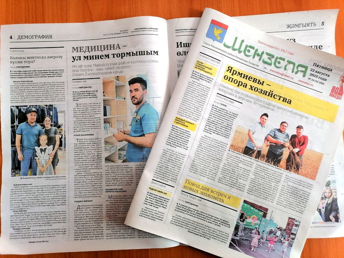 🌞 Пятница — а это значит, что уже ждет своего читателя свежий номер «Минзәлә» - «Мензеля» 🗞️ 👨🌾 На первой полосе — история целой династии! Знаете ли вы, что в хозяйстве в Калмурзино работают семейные бригады? Отец и два сына Ярмиевы — настоящие герои жатвы. Узнаем об их труде и секретах дружной семьи. 🍅 Вкусно и полезно! Что вкусного приготовить из помидоров и сливы? Ищем новые рецепты заготовок на зиму на 3-й странице в нашей постоянной рубрике. 👶 Знакомьтесь: новый педиатр! В детской консультации — новый молодой специалист. Наш журналист Ильсияр Хаертдинова пообщалась с Дянчем Джумагелдиевым. Все о его пути в медицину и подходе к работе — в большом интервью на 4-й странице. 📚 Во сколько обходится 1 сентября? Рядом с интервью — результаты нашего опроса: «Сколько стоит собрать ребенка в школу?». Узнаем, во сколько оценили мензелинцы подготовку к учебному году. ✨ Как провели каникулы с пользой для души? Читаем на 6-й странице о детских духовно-оздоровительных курсах в Мензе