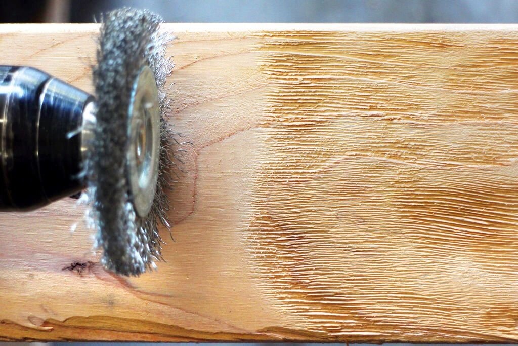 Иногда нужно не просто выровнять поверхность, а подчеркнуть фактуру дерева, сделать его «возрастным». Для этого используют щеточные шлифмашины.