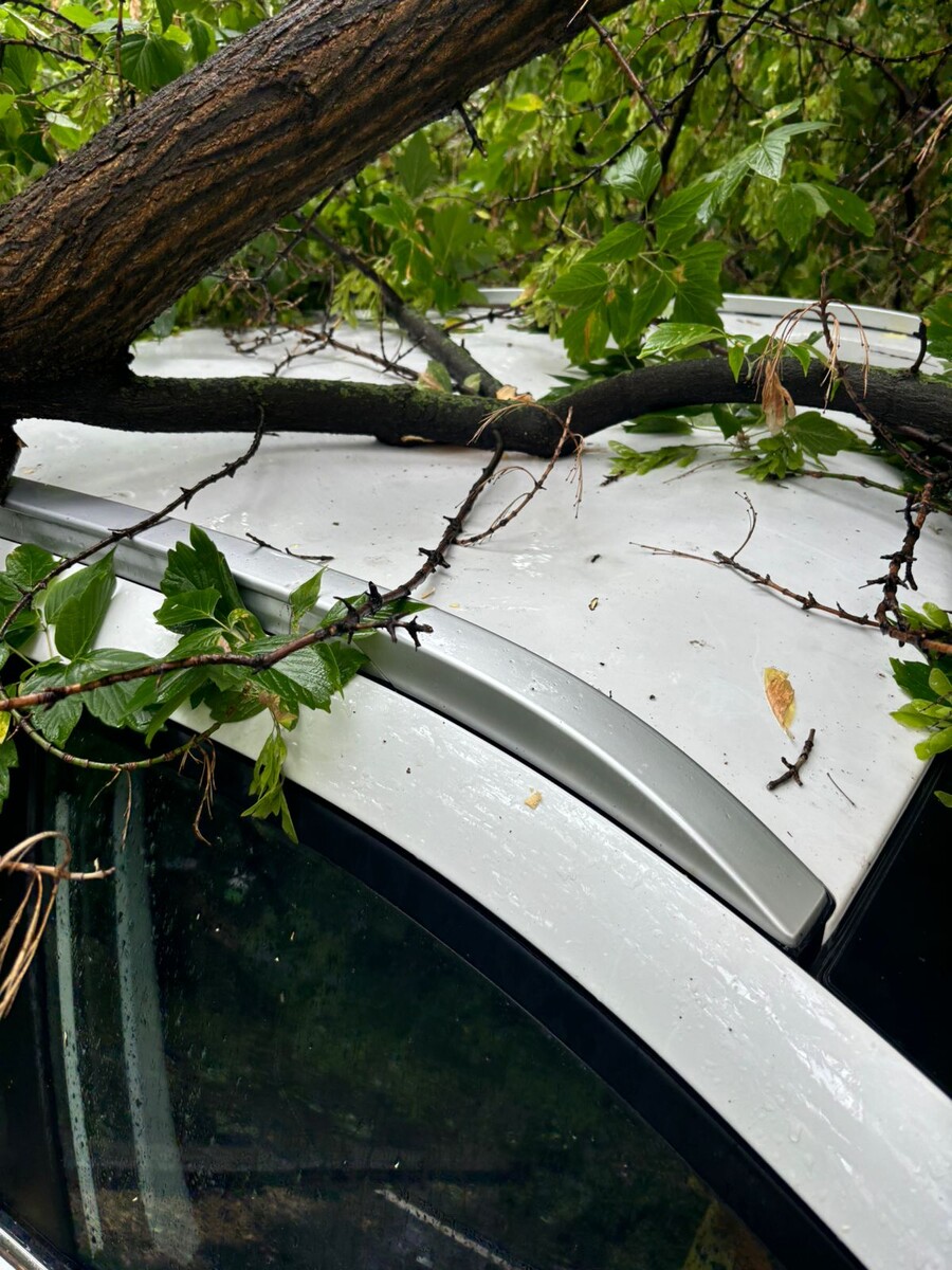 Выйдя на улицу в кроне лежащего дерева я даже не мог увидеть свою ласточку. Походив вокруг упавшего дерева я понял, что оно лежит четко на моей машине, опираясь крупной веткой на ее крышу, от чего крыша вмялась внутрь.