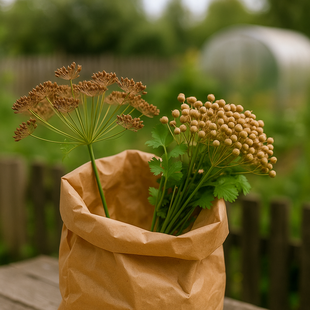 Зачем: как только семена созреют, они падают в мешочек, а не на землю. Пошагово (укроп): Что делаю: в одну руку беру крафтовый пакет, в другую — секатор. Ввожу зонтик в пакет и срезаю внутрь.