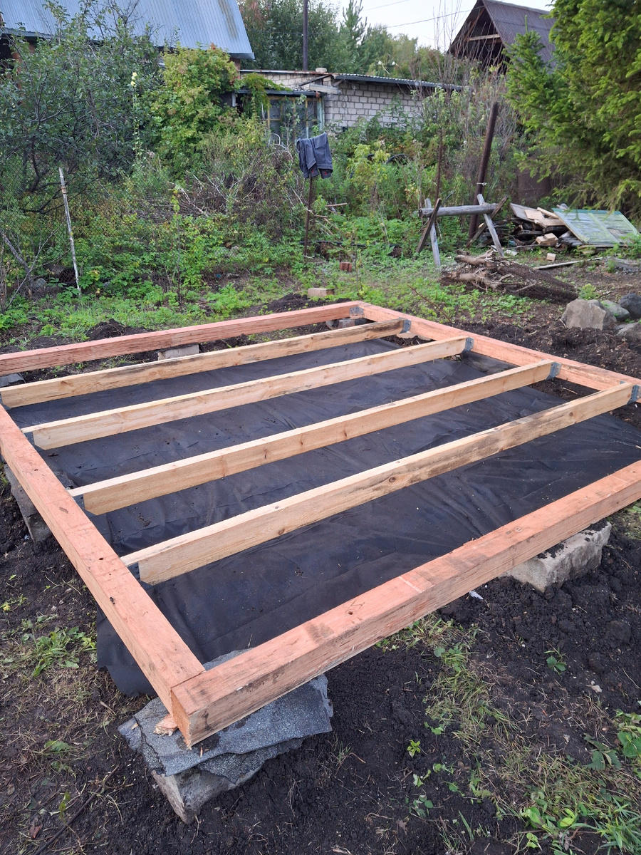 Всем привет! Недавно приезжали родители из Казахстана в гости. И Папа сказал сын надо строить беседку! Ну и как говорится тут поннслось. На даче нашли блоки (даже не знаем откуда они). Распределили место где будет беседка и начали ровнять блоки по уровню с брусом. Но дождь не давал нам работать. Буквально за весь день мы сделали только будущий каркас беседки 3×3 метра. Выровнили всё по уровню и оставили так. Родители уехали, а строить надо дальше! Уже на следующей недели мы приехали с Ксюшей застелили землю геотекстилем и сделали поперечные лаги для пола! Такими небольшими шагами идем к нашей цели!