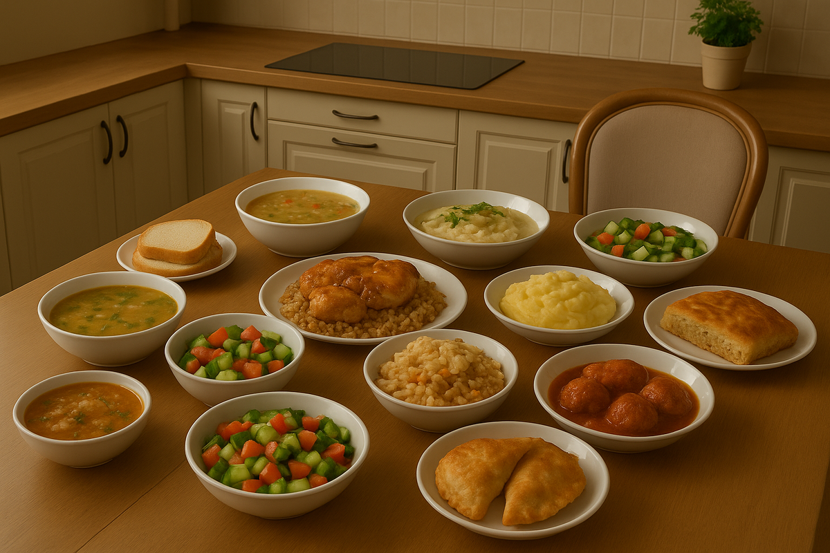 🍽 Обед: Харчо + хлеб 🍽 Ужин: Куриные бедра в соевом соусе + рис + салат из свежих овощей 🍽 Обед: Суп гороховый с копчёностями 🍽 Ужин: Рыба в сметане + картофельное пюре + салат «битые огурцы» 🍽 Обед: Рассольник с перловкой 🍽 Ужин: Макароны с фрикадельками в томатном соусе 🍽 Обед: Суп куриный с лапшой 🍽 Ужин: Голубцы с фаршем и рисом + сметана 🍽 Обед: Борщ со сметаной + чесночные гренки 🍽 Ужин: Плов с курицей и овощами 🍽 Обед: Окрошка на кефире 🍽 Ужин: Домашние чебуреки с мясом + овощной салат 🍽 Обед: Щавелевый суп + яйцо 🍽 Ужин: Пицца «Домашняя» (курица, сыр, помидоры) + свежие овощи Булочки с маком, пирог с картошкой и луком. Классический овощной (огурец, помидор, лук) «Битые огурцы» Витаминный (капуста + морковь + яблоко) Курица, фарш, рыба, овощи (картофель, морковь, капуста, свекла, огурцы, помидоры), крупы (рис, перловка, макароны), молочные продукты, зелень.