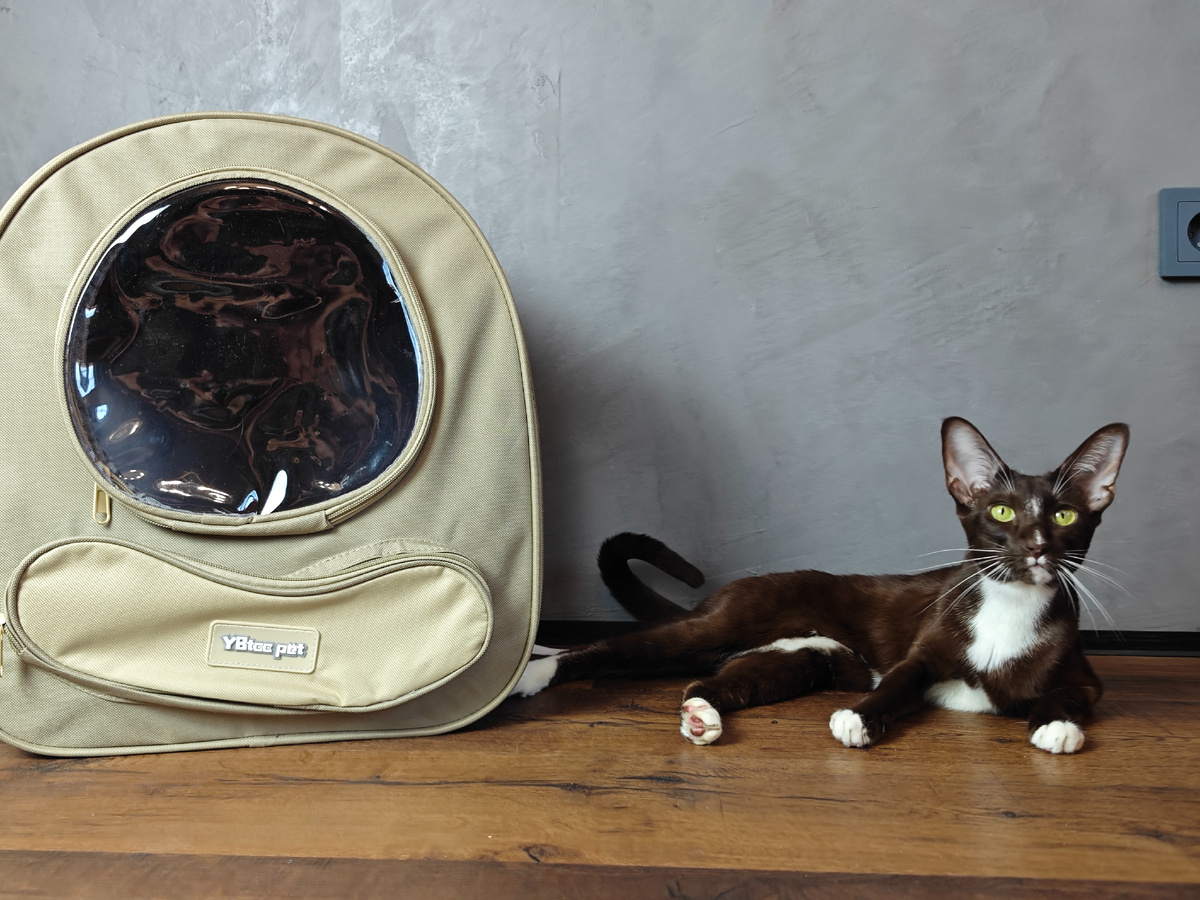 На самом деле, интриги никакой не будет: мы ушатали старую переноску, и нам пришлось искать новую. Уже на опыте, так что требования к новому кошачьему транспорту на человеческой тяге были вполне конкретные требования. Во-первых, это точно уже должна быть не сумка, а рюкзак, но с возможностью взять его за ручку и носить как сумку иногда. Кошка уже тяжёленькая, да и неудобно носить громоздкую сумку: все время, как ни старайся нести аккуратно, где-нибудь резко повернешь или вообще треснешь об угол, отчего можно сразу прибавлять +100 к стрессу. Животное не видит ни меня, ни окружающий мир, а ей этого очень важно, чтобы иметь иллюзию контроля - отсюда ещё одно требование - прозрачное окошко, в которое Мёрфи теперь наблюдает мир. Видела такие в соц сетях, решила поискать на вб и нашла здесь Конечно, при всем прочем нужно хорошее качество, чтобы переноска служила долго. Отличным бонусом стала непромокаемость - теперь можем путешествовать хоть под дождем, хоть под снегом и кармашек на мол