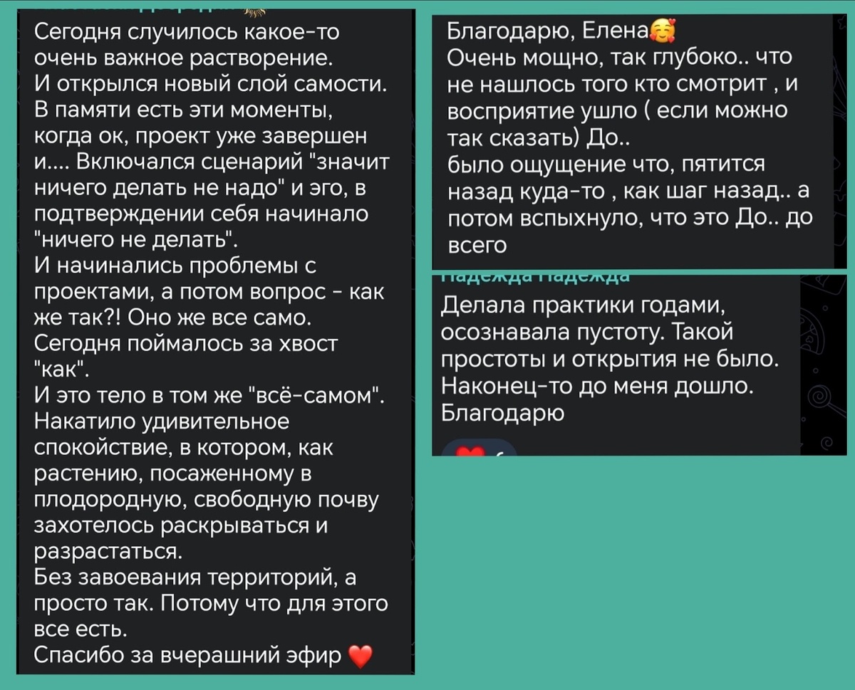 Когда задумываешься о распаде я, то появляется растерянность: как же теперь жить, зачем что-то делать? Кажется, что всё привычное становится неактуальным. Но на самом деле это не о том, что нужно отказаться или прекратить, а о том, что исчезает делатель. ОНЛАЙН-ПРАКТИКУМЫ идеальны для того, чтобы погрузиться в Ясность и начать жить с новыми ощущениями лёгкости и безусильности: ✔️Всё уже есть ✔️Всё происходит само ⚡Можно присоединиться к текущему практикуму «Осознавание: Жизнь без центра»: посмотреть прошедшие сессии в записи и 25.08 в 16:00 мск участвовать в ВИП сессии вопрос-ответ (для тарифа «ЗОЛОТО»). Жизнь без центра касается всего: профессии, отношений, здоровья, творчества. Просто становится очевидно: всё есть, происходит без нужды держать или контролировать. И кажется, что приняла решение отказаться. Но нет того, кто принял решение. Оно просто вспыхнуло. Участники практикума уже после первой сессии делились новыми ощущениями и осознаваниями⬇️ ⚡Присоединяйтесь⬇️ Осознавание: Жи