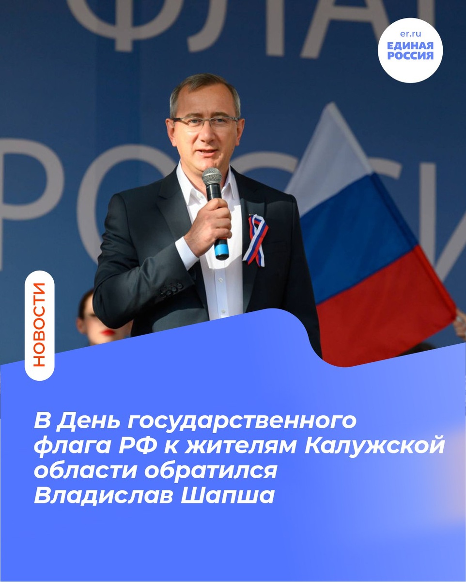 "Уважаемые жители Калужской области! Российский флаг является для нас символом многовекового исторического пути нашей страны. В его цветах наше славное прошлое и вера в наше достойное будущее. С нашим триколором мы идем к новым победам - военным, экономическим, социальным. Именно он объединяет десятки регионов и сотни национальностей страны в стремлении преодолеть любые препятствия, решить задачи любой сложности на благо всей России. Сегодня наш стяг гордо развивается над освобожденными селами и городами в зоне спецоперации, пробуждая лучшие патриотические чувства и гордость за свою Родину. Пусть государственный флаг России всегда реет над нашей сильной и процветающей Отчизной. С праздником вас, дорогие земляки! С днем нашего флага!" Секретарь регионального отделения партии «Единая Россия», губернатор Калужской области Владислав Шапша #ЕР40 #ЕдинаяРоссия