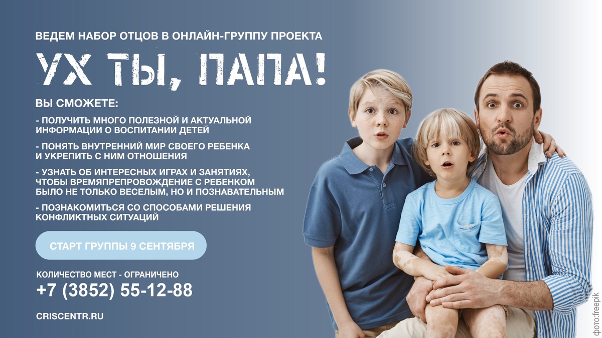🧸Краевой кризисный центр для мужчин приглашает отцов в онлайн-группу «Ух ты, папа!» 💻Группа проходит в онлайн-формате при помощи платформы Telegram. Такой формат даёт возможность самостоятельно выбрать время и место для прохождения занятий и выполнения заданий. В течение шести недель в общем чате будет появляться информация в аудио-, видео- или текстовом формате, а также задание по каждому блоку. Старт группы - 9 сентября, количество мест ограничено. Участие бесплатное, но, потребуется заполнить заявление. ➡️Запись возможна по тел: +7 (3852) 55-12-88 или по адресу Кризисного центра для мужчин: г. Барнаул, ул. Г. Исакова, 113е. ➡️Регистрация на участие в проекте по ссылке: https://forms.gle/1GhVtfRuiB2WDkJf8 ✅Подробную информацию читайте на сайте Кризисного центра для мужчин: http://www.criscentr.ru/article/1/1056 #Алтайскийкрай #Минсоцзащита_22