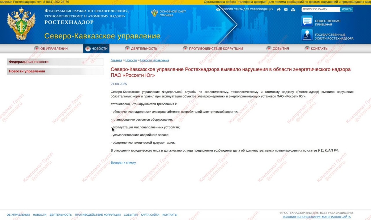 21 августа «Ростехнадзор» снова вынужден был выйти с официальным сообщением: ПАО «Россети Юг» во второй раз за месяц поймано на системных