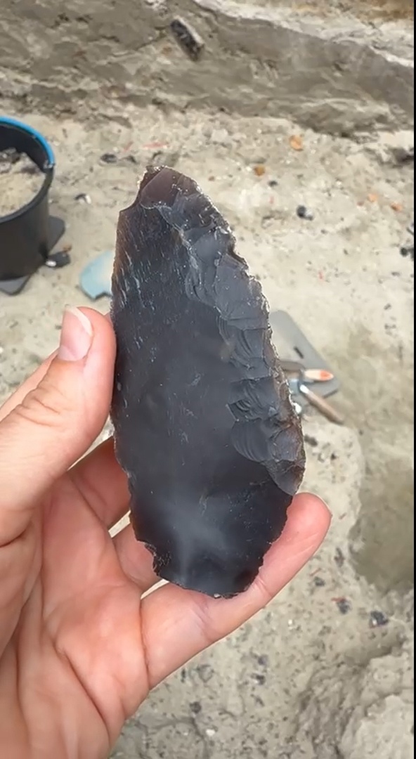 Нет, неандертальцы не охотились на ихтиозавров, просто они устроили стоянку на слое мелового периода. Наши друзья из Верхнедеснинской экспедиции ИИМК РАН ведут раскопки памятника среднего палеолита в селе Хотылёво Брянской области (экспедиция работает при поддержке общественного движения «Проекты Станислава Дробышевского»). И вот в слое возрастом примерно 80 тысяч лет археологи сделали сразу несколько крутых находок. Это, во-первых, тонкий кремневый остроконечник, посмотрите какой красивый! "Я даже не знаю, в каких еще коллекциях есть такие остроконечники, — восхищается руководитель экспедиции, к.и.н. Александр Очередной. — Есть похожий по форме в коллекции Кёнигзау, но он толще. Новая находка сделана из очень хорошего тонкого отщепа. У неё две лезвийные кромки, равные по длине, совершенно симметричные, а одна из них обработана еще и с двух сторон." Во-вторых, археологи нашли очень редкий костяной ретушёр, то есть инструмент для доработки кромки каменного орудия. Третья примечательная