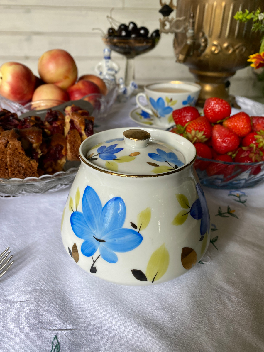 Мне физически не хватает красивых чаепитий. Времени нет, чтобы их устраивать. Работа и быт в будни, садовые дела на выходных. И если в городе на сервировку банально не хватает часов в сутках, то в деревне часок выкроить удается. Даже если ради чая придется бросить дела. Их переделать невозможно, а я у себя одна. И мне просто необходимо периодически творить и получать вдохновение от сервировки. Пока мои ходили за кабачками, я быстренько соорудила вечерний стол. Первым делом воду в самоваре поставила кипятиться. Бегаю туда-сюда мимо, а он тихонечко так гудит, подгоняет меня😊. У меня их два - этот латунный я забрала из деревенского дома родственников, когда они готовили его к продаже. Он наш, тульский. А второй - стального цвета, бабушкин. Она всегда его на праздники на стол ставила. Среди фарфора выбор пал на самый мой любимый сервиз - «8 марта»Пролетария. Комплектация у него полная, но молочник был не нужен, не доставала его. Он семейный, достался от сестры бабушки. Хотя сколько ра
