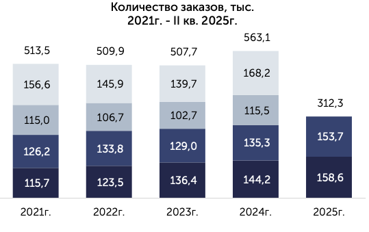 По итогам I полугодия 2025 года наблюдается снижение, объёмы контрактов упали ниже уровня 2022 года. Суммарный объём контрактов за I-II кв. 2025 года составил 454,1 млрд руб., что на 19,7% ниже I-II кв. 2024 года (565,8 млрд руб.).