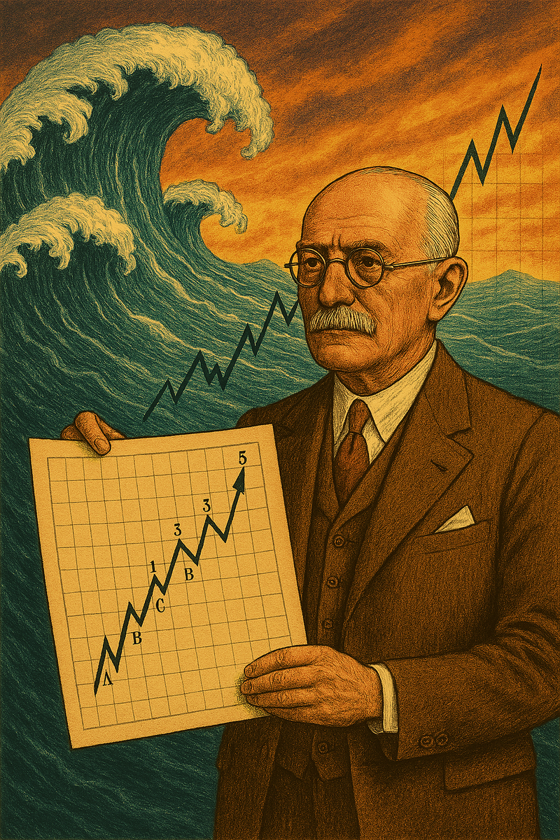 Тебе не нужно “чувствовать рынок”, чтобы понять волны. Представь цену как море: прилив толкает воду серией волн вперёд, отлив — откатывает. Эллиотт просто дал этому повторяющемуся ритму имена и правила.