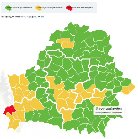 В связи с выпавшими осадками и понижением класса пожарной опасности, на территории Речицкого района с 22 августа 2025 года снят запрет на посещение лесов гражданами, сообщили в Речицком лесхозе. Оперативную информацию о запретах и ограничениях на посещение лесов всегда можно найти на интерактивной карте Министерства лесного хозяйства. В случае обнаружения возгорания вблизи лесного фонда или в лесу незамедлительно просим сообщить в ближайшее лесничество или дежурному по пожарам по номеру 8(02340)7-98-30 или в РОЧС по номеру 101.